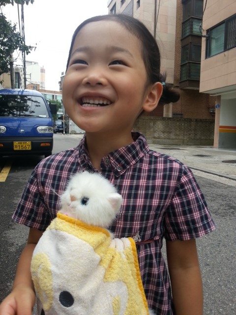 고양이 인형을 데리고 가야겠다면서 야무지게 포대기하고 나왔어요 ㅎㅎ